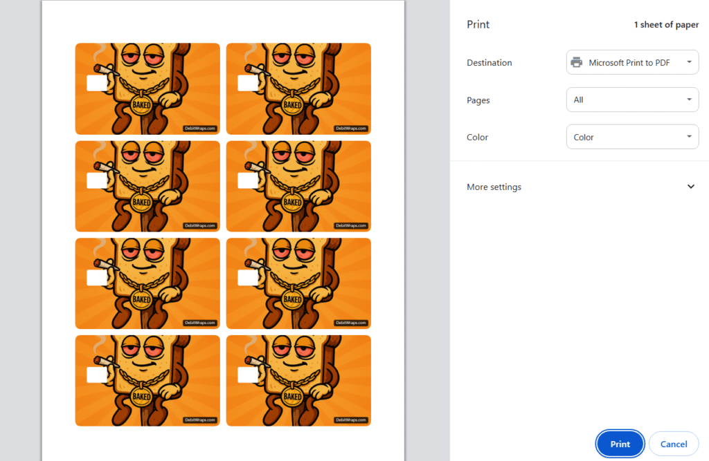 Turn your preview into a precise, print-ready sheet. DebitWraps lays out your skins on US Letter with ISO 7810 ID-1 sizing (85.6 × 53.98 mm), 6 mm outer margins, and 4 mm spacing between cards. You’ll get a neat 2×4 grid (up to 8 skins) that’s easy to cut—no fiddling with templates or scaling.